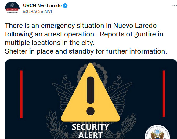 EL CONSULADO DE ESTADOS UNIDOS EN NUEVOLAREDO ALERTÒ A SUS CIUDADANOS INMEDIATAMENTE DESPES DE QUE EMPEZARON LAS BALACERAS